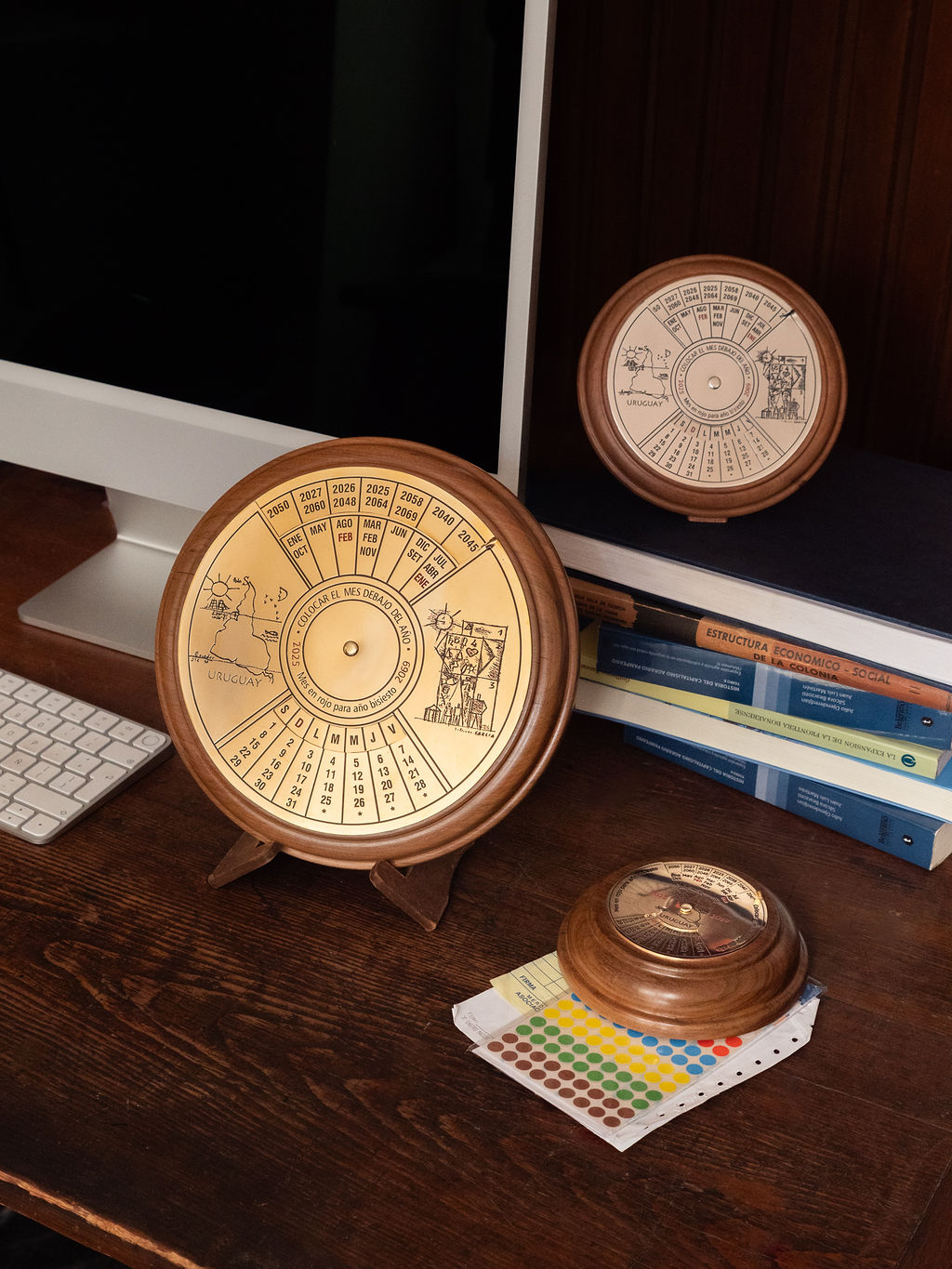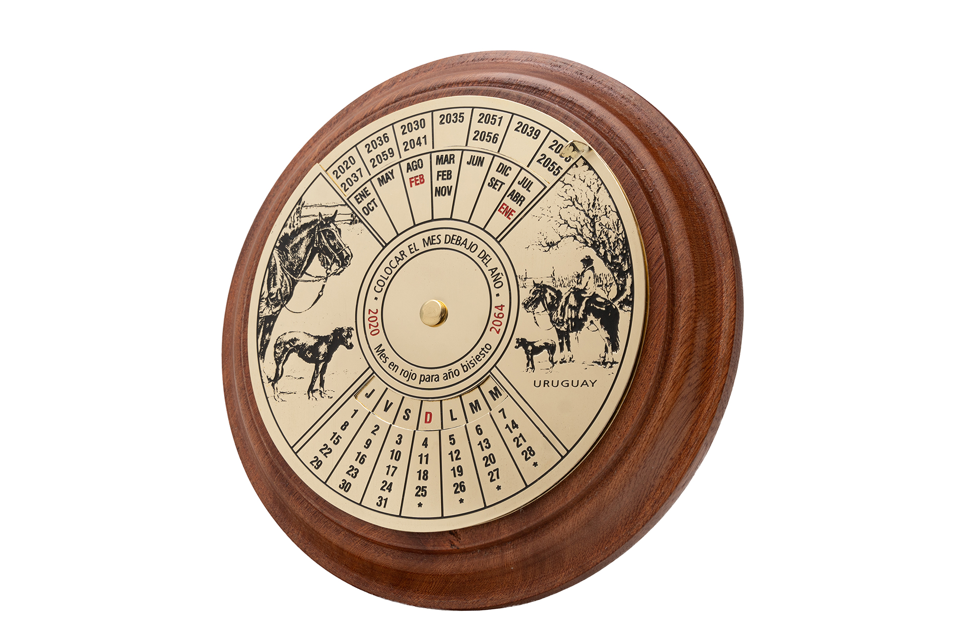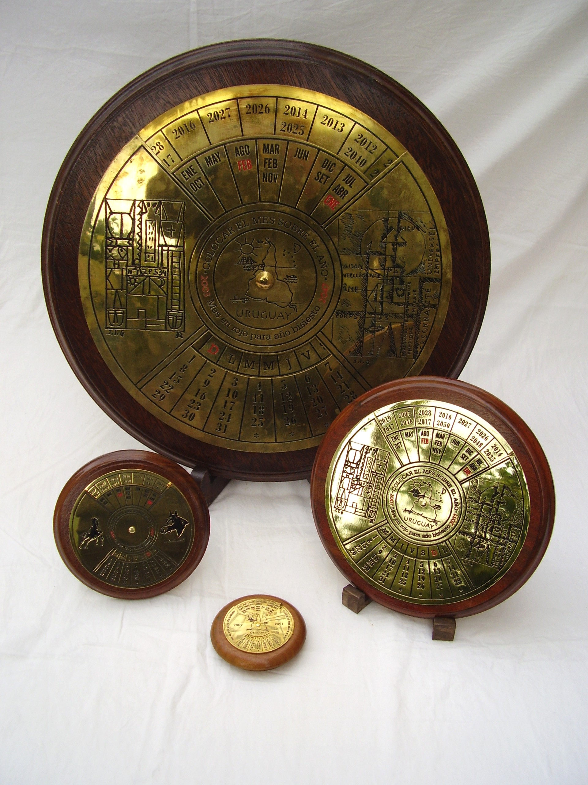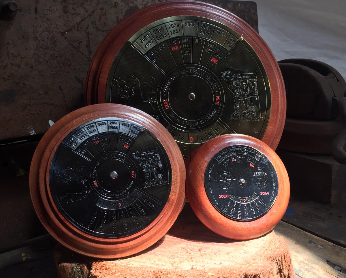 La línea de calendarios se comenzó a producir en nuestro taller en 1998, inspirada en una pequeña pieza antigua. Investigamos su origen y el sistema de cálculo matemático utilizado, y diseñamos piezas de mayor tamaño incorporando madera de distintos formatos. Se realizan en bronce y acero, con grabados de logos, textos, diseños constructivos inspirados en Joaquín Torres García, imágenes criollas o de campo, diseños náuticos y personalizados.