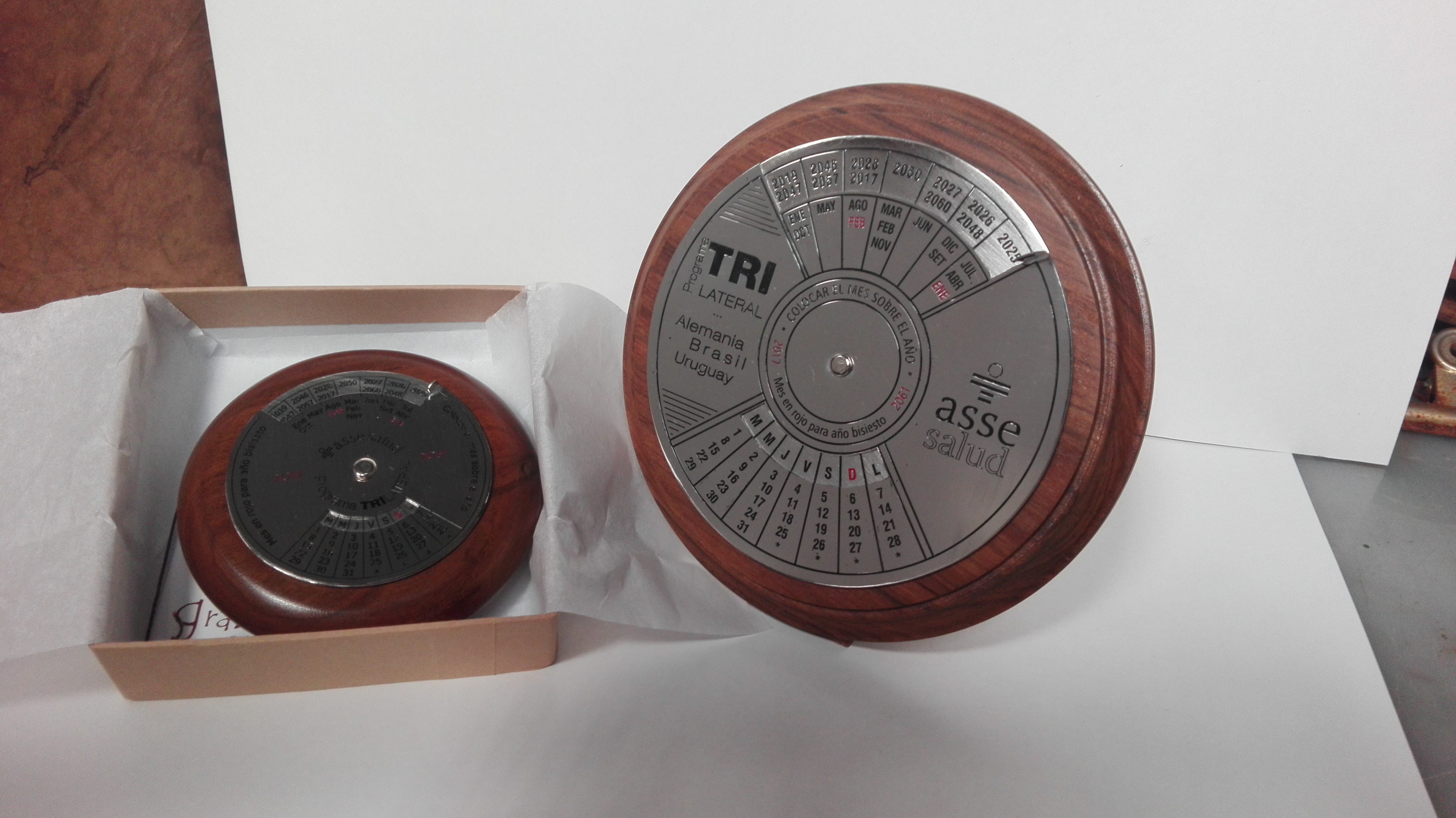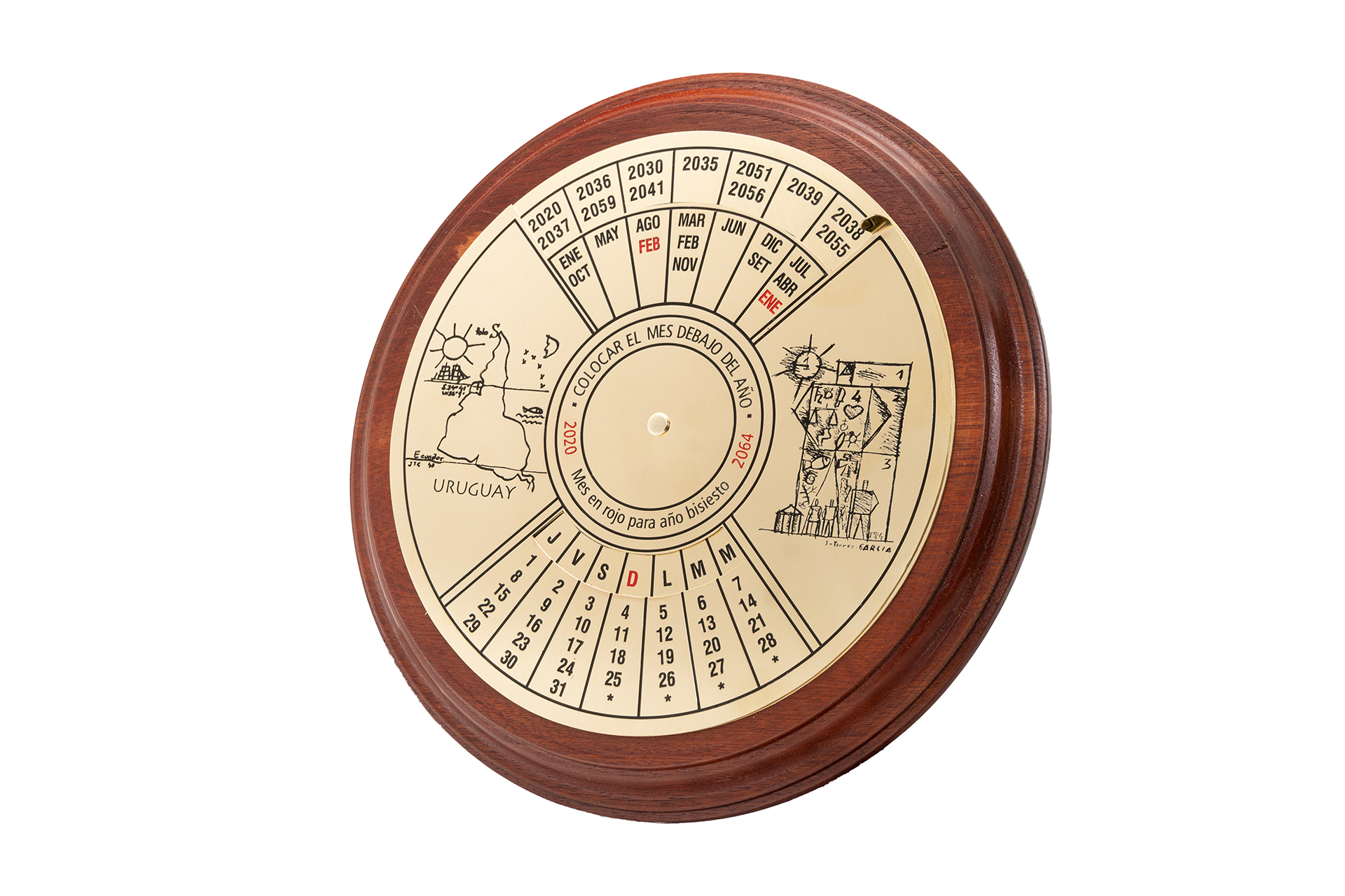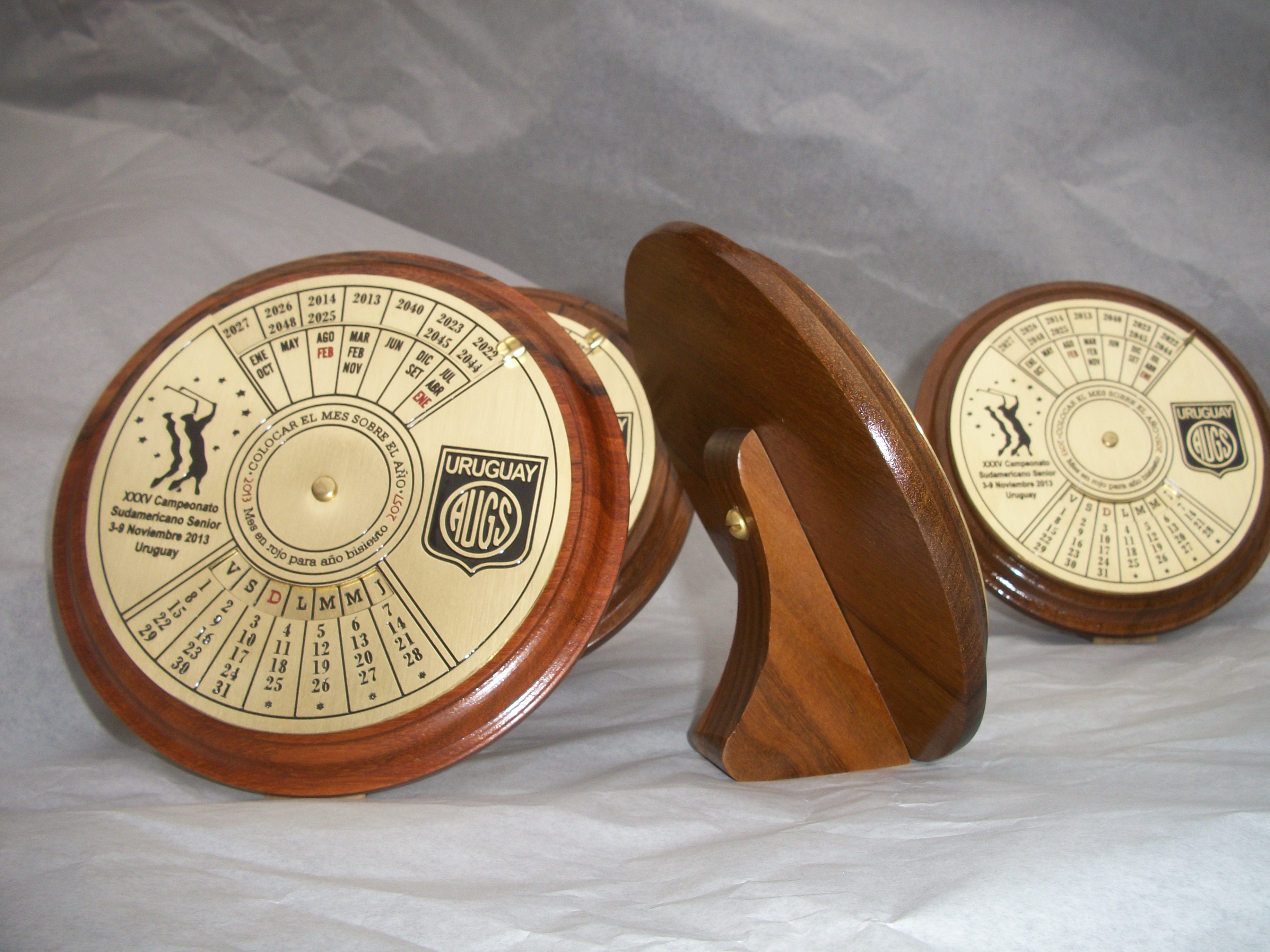 La línea de calendarios se comenzó a producir en nuestro taller en 1998, inspirada en una pequeña pieza antigua. Investigamos su origen y el sistema de cálculo matemático utilizado, y diseñamos piezas de mayor tamaño incorporando madera de distintos formatos. Se realizan en bronce y acero, con grabados de logos, textos, diseños constructivos inspirados en Joaquín Torres García, imágenes criollas o de campo, diseños náuticos y personalizados.