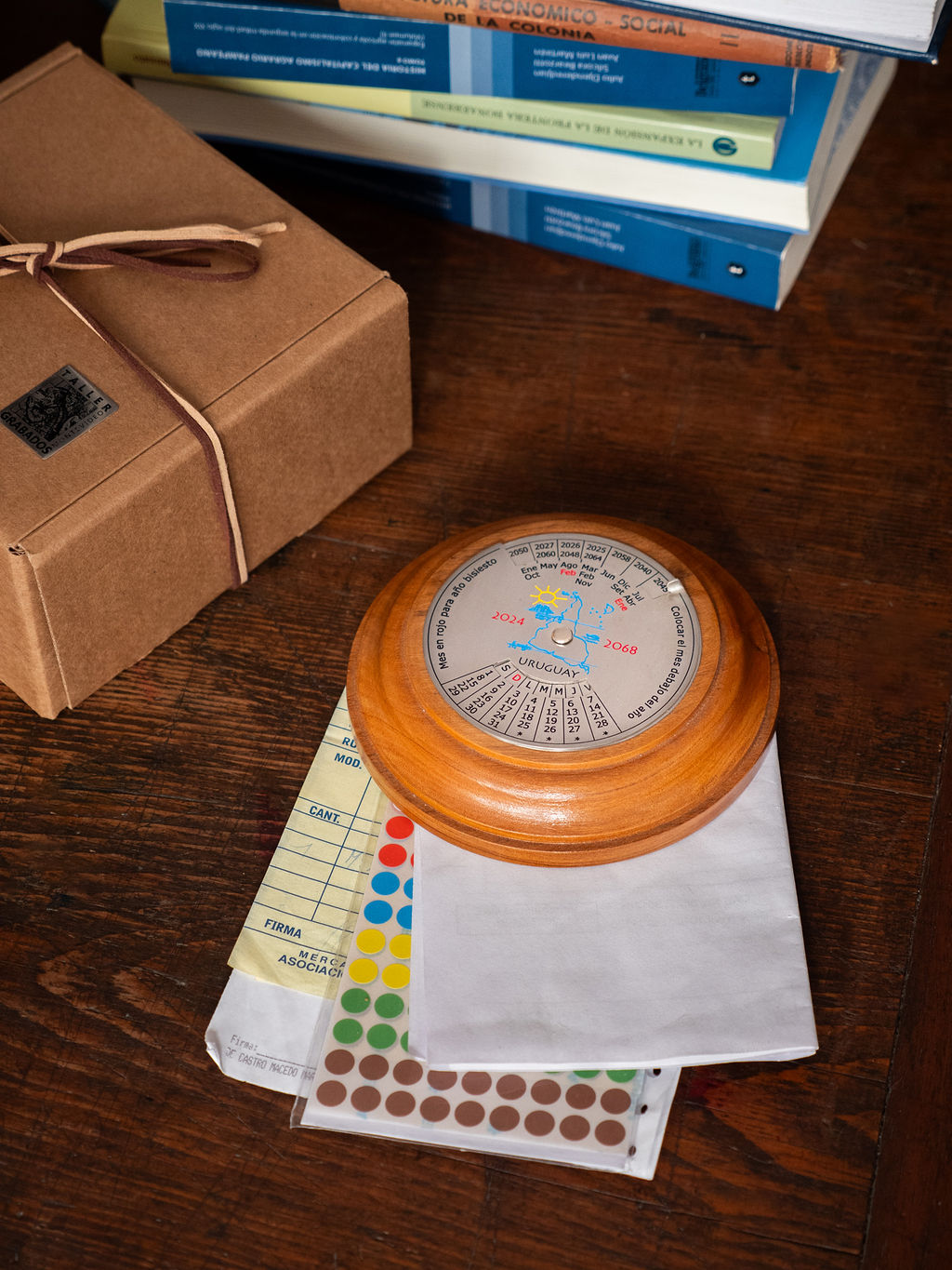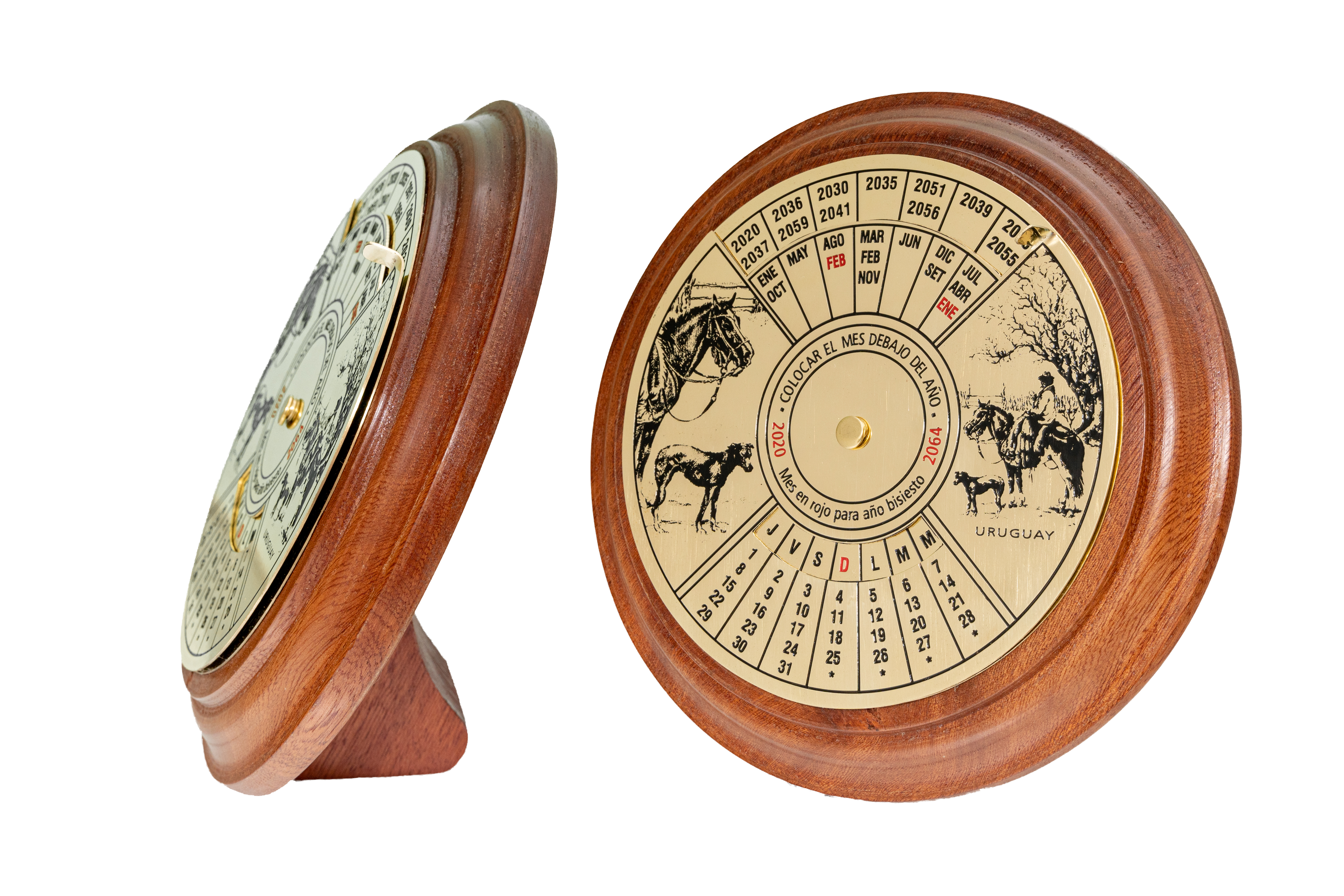 Cada calendario se actualiza anualmente, ofreciendo más de 45 años de uso, combinando diseño original, utilidad y funcionalidad. Su sistema es sencillo: se enfrenta el mes al año y se obtiene la fecha correcta, moviendo la pieza para cambiar de mes. Una creación artesanal que une tradición, estética y practicidad, ideal para el hogar o como regalo empresarial.